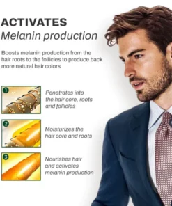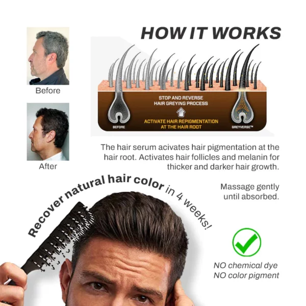 Gray hair is caused by a decrease in melanin, an essential pigment that provides color to your skin and hair. You may notice a gradual shift from dark brown or black hair to silver or white strands, but this change can also be sudden and drastic. It’s no secret that those who battle greying hair go through a bit more than their fair share of frustration when trying to hide the changes caused by aging. Our anti-greying serum can help you blend away unwanted grays and bring back your youthful color with each use.