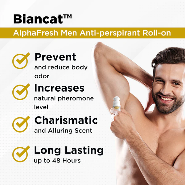 Harness Unstoppable Freshness, Ignite Your Inner Alpha, Experience unbeatable 48-hour body odor protection with Biancat™ AlphaFresh Men Anti-perspirant Roll-on!
