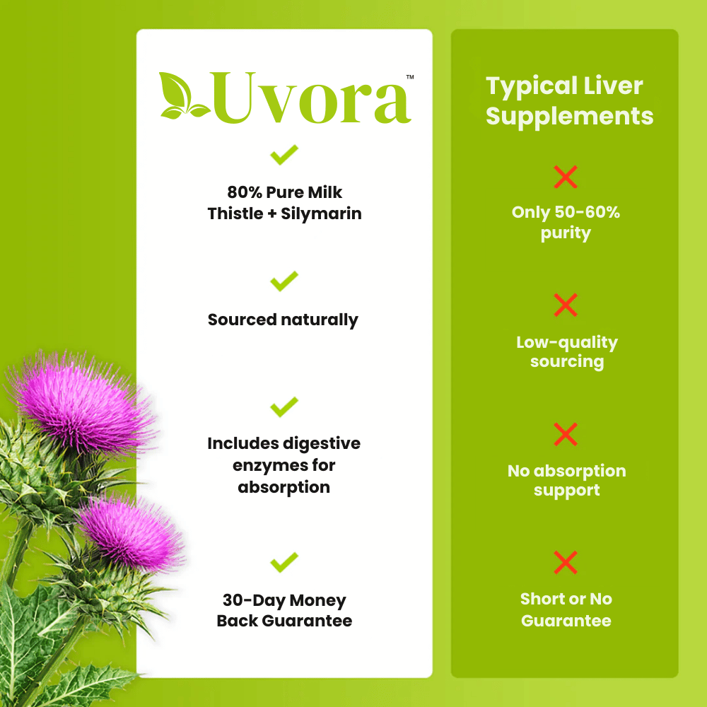 Is it really “just age,” or is your liver struggling under years of toxins? For adults over 45, a clogged liver is often the hidden cause behind persistent bloating, brain fog, and the dreaded 2 p.m. crash. Uvora™ Milk Thistle Capsules are engineered to undo the damage of alcohol and processed foods by delivering a high-potency formula that flushes out up to 35 lbs of trapped waste. It’s time to stop fighting a losing battle and start repairing your health from the core.